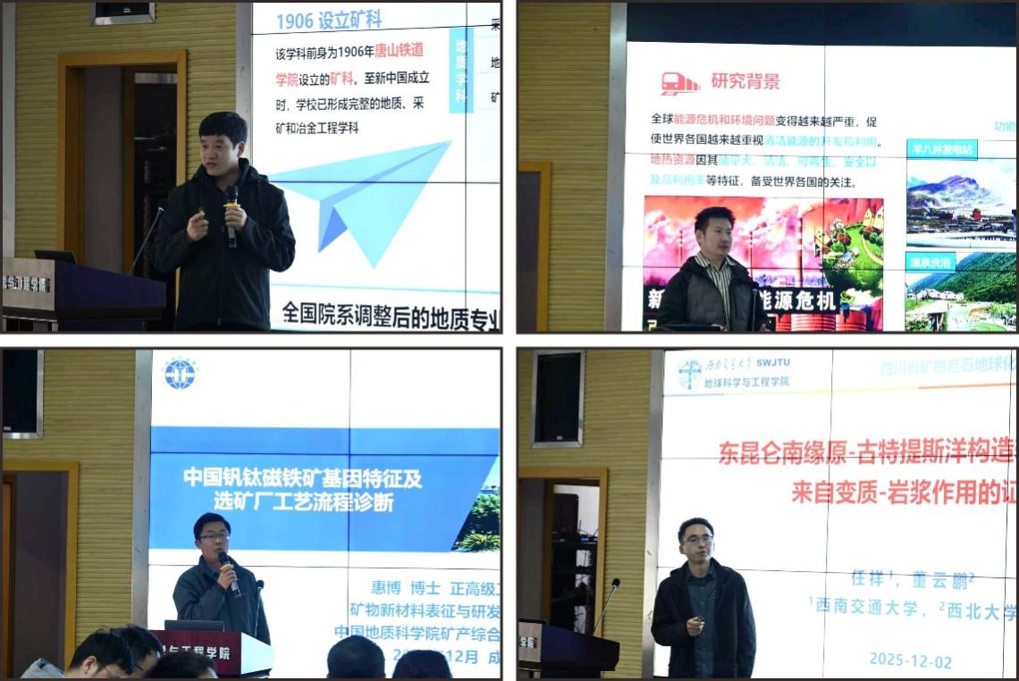 地质学科的发展现状。随后,西南交通大学张云辉副教授作了题为“青藏高原深大断裂带地热成因研究进展”的学术报告,重点阐述了地热流体的地球化学特征与数值模拟方面的最新成果;中国地质科学院矿产综合利用研究所惠博正高级工程师以“中国钒钛磁铁矿基因特征及选矿厂工艺流程诊断”为题,从研究背景、矿石基因特征及工艺流程诊断案例等方面展开,研究内容前沿、方法丰富,并对未来合作方向进行了展望;西南交通大学任祥博士后作了题为“东昆仑南缘原-古特提斯洋构造转换关系:来自变质-岩浆作用的证据”的报告,围绕原-古特提斯洋构造转换这一科学问题,基于对东昆仑造山带苦海岩群的精细研究,展示了该领域的最新进展。