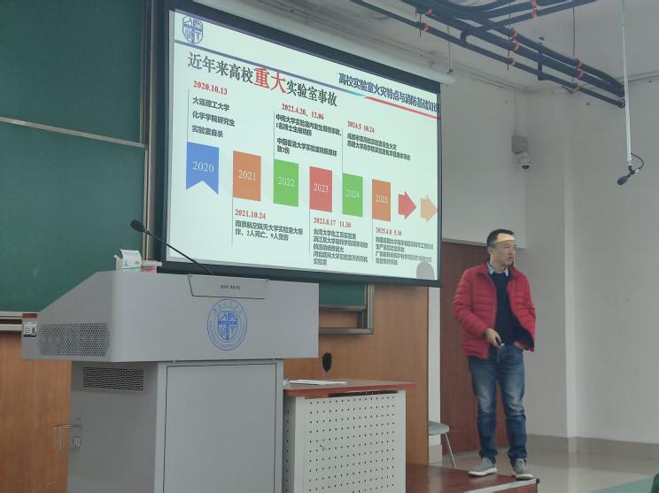 随后,李涛老师以“高校实验室消防安全管理与应急处置”为题,深入解读了国家和学校对实验室消防安全管理的要求。他首先讲解了高校实验室火灾原因特点与消防基础知识,重点结合《高等学校实验室消防安全管理规范》分析了高校实验室消防安全管理总体要求和责任体系及灭火和应急疏散预案编制和演练,对实验室消防安全检查、安全应急处置重点内容进行了详细讲解,分享了实验室消防安全管理方面的具体实践经验。