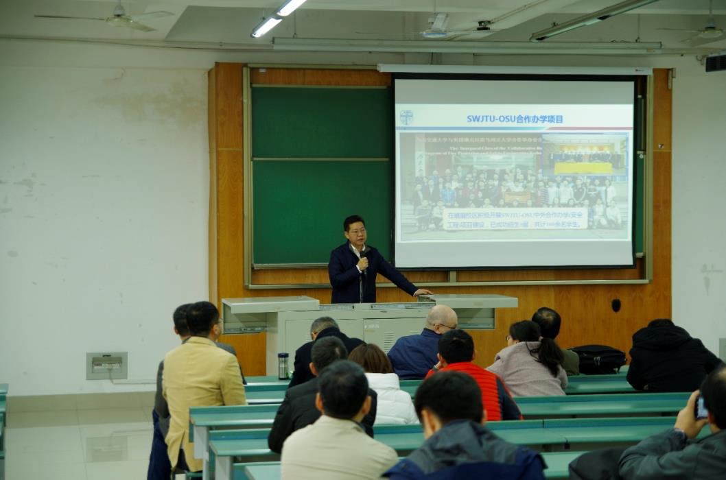 副院长兼副书记许军华,对西南交通大学与美国俄克拉荷马州立大学合作举办安全工程专业本科教育进行项目介绍。重点介绍了本项目的师资情况、设施建设、制度建设、保障体系、学术情况、就业前景,以及面临的挑战等。