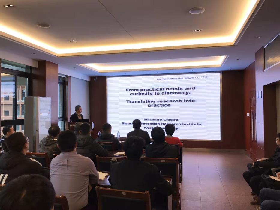 千木良雅弘教授做了题为《From practical needs and curiosity to discovery:Translating research into practice》的精彩学术报告,报告会中千木良雅弘教授结合他三十多年来的科研工作经历,重点在岩石风化与滑坡变形两个研究方面,从如何通过野外地质现象思考进而转化为科学实验机理研究,依托他三十余年来所研究的多项经典案例,向大家详细生动的介绍了科学问题研究的全过程与其个人丰硕的研究成果。