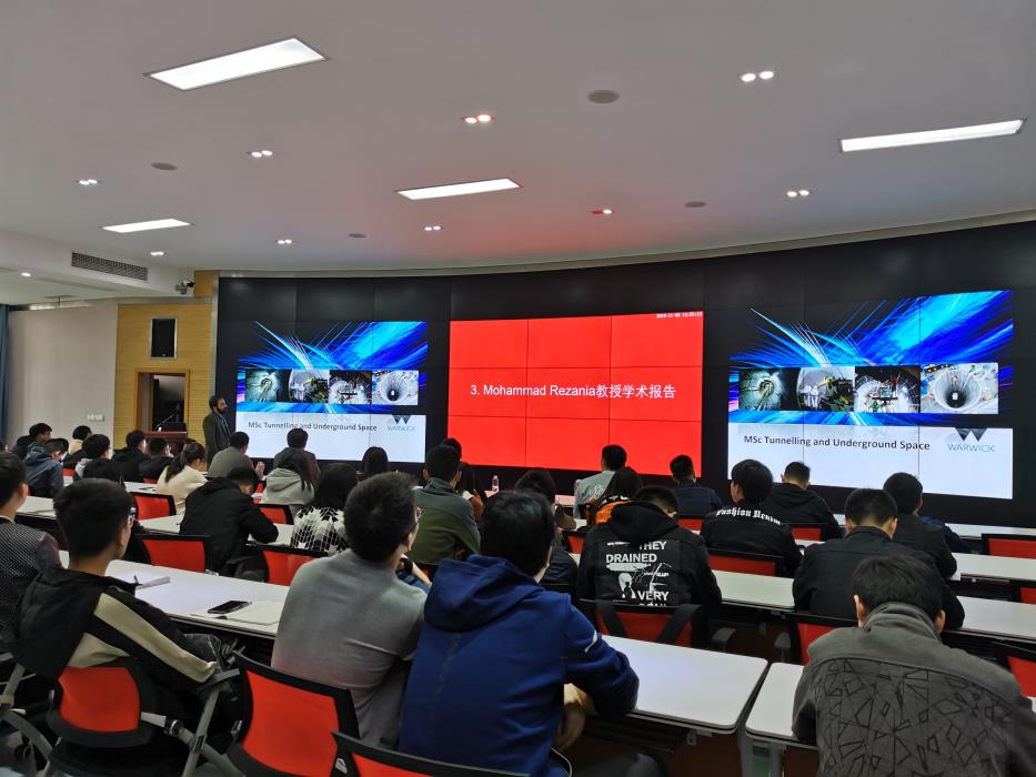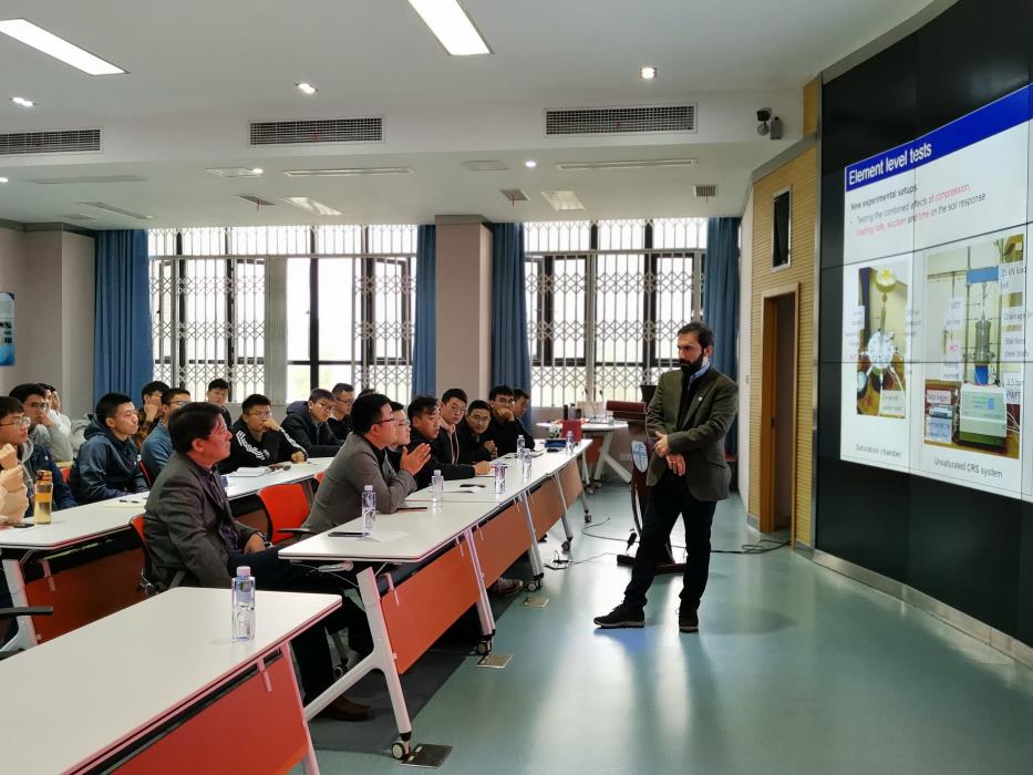 在聘任仪式结束以后,Mohammad教授以“Constitutive modelling of natural soil behavior, experimental verifications and applications”为题,进行了一场学术报告。在报告中,Mohammad教授首先对岩土本构模型由浅及深进行了讲解,阐述了传统岩土本构的缺点,再结合各向异性、时间独立性等因素对传统本构进行优化,以求反应真实的天然土体行为。在介绍完岩土本构模型之后,Mohammad教授就MPM物质点法在地质灾害模拟方面的应用、固结仪的优化处理、矿山修复、基质吸力测量等多个学术热点话题发表了自己的见解。最后,Mohammad教授介绍了华威大学的硕士课程,希望能够加强与西南交通大学的合作与交流。