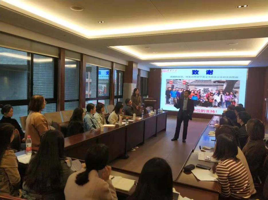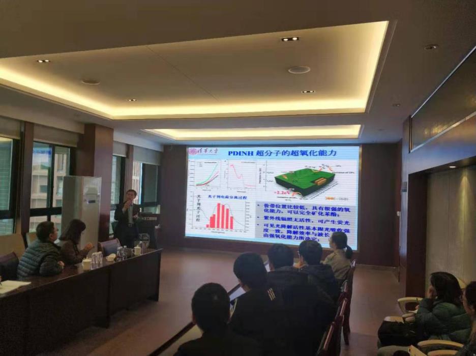 犀浦校区X4520会议室,朱教授做了题为《全有机超分子可见光催化环境、能源和肿瘤去除探索》的精彩报告。报告会中,朱永法教授从光催化材料的众多应用前景,结合当下光催化高性能热点材料,介绍了自己这些年来所做的众多优异工作。随后,朱永法教授介绍了氨基取代的PDI超分子光催化材料的应用、红光激发光催化活性机理、TCNQ-PDI相互作用、P25与PDI的复合结构、PDI与石墨烯的π-π作用、超分子组装纳米片结构、光催化在肿瘤快速杀灭上的应用探索等方面的研究成果。此外,朱永法教授还介绍了他们课题组在全有机超分子可见光催化降解有机污染物及肿瘤消除的最新研究进展。