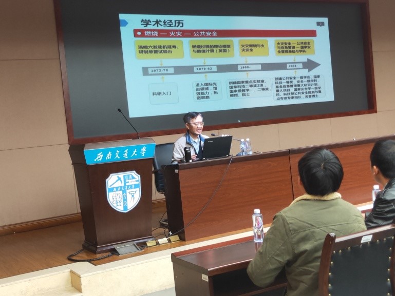 会前,范维澄院士在综合楼148会议室作题为“从燃烧、火灾到公共安全——学术轨迹与公共安全科技”的专题学术报告。范维澄院士结合自己的学术经历,详细介绍了从燃烧转向火灾科学的一些思考及火灾科学研究,并结合我国的公共安全现状详细讲解了“公共安全三角形”理论模型、我国公共安全技术体系以及公共安全网的构建,对我国未来公共安全所面临的问题与挑战进行了展望与思考。报告最后,范维澄院士与师生们进行了交流互动,范维澄院士建议依托学校的特色、优势学科加强不同学科之间的交流和思想碰撞,在此过程中产生新点子、新思想。本次学术报告会现场座无虚席,师生们都表示获益匪浅。最后,张玉春教授对范维澄院士的精彩报告表示感谢。