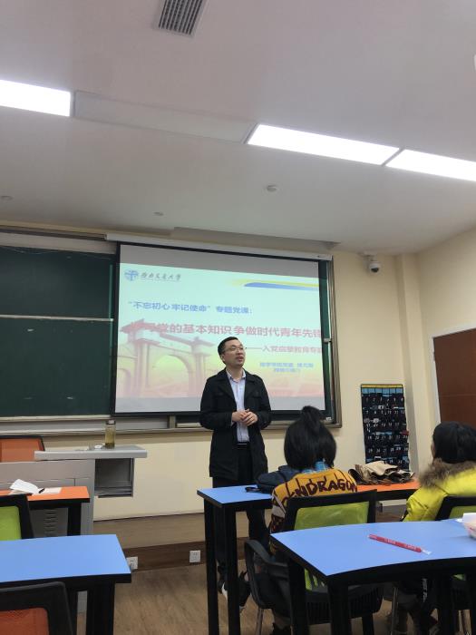 然后,傅尤刚就“学习党的基本知识,争做时代青年先锋”主题对同学们进行了入党启蒙宣讲。其一从阐述党的发展历史出发,以故事的形式逐步说明在共产党的领导下,祖国越来越繁荣富强的奋斗历程;其二从为什么入党、需要了解的党基本知识、向优秀党员学习什么和怎样加入党组织四个方面进行详细解读;其三呼吁同学们向党组织靠拢,积极入党,引用“问渠哪得清如许? 为有源头活水来”表明优秀青年同志们的不断加入才是党永葆青春,可持续发展的力量源泉。