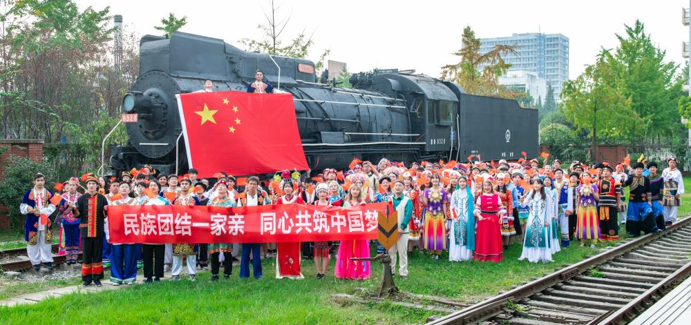 活动中,各民族同学身着民族盛装、手持五星红旗,像花团一样、像石榴籽一般,依次簇拥在升旗台、校史馆、机车博物园等各个校园地标里,流转于牵引动力国家重点实验室、陆地交通地质灾害防治技术国家工程实验室、高速列车数字化仿真平台内的各大重器间,青春、靓丽、灵动而活泼,成为了校园里一道美丽的风景线!