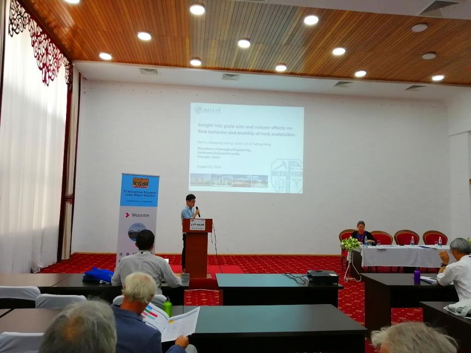 程谦恭教授研究团队博士研究生林棋文、李坤参加了本次会议,在“地震与滑坡灾害”分会场中,针对高速远程滑坡动力学机理这一国际热点问题,分别进行了相应的主题报告。林棋文博士进行了题为“Effects of rock mass discontinuities on the deposit