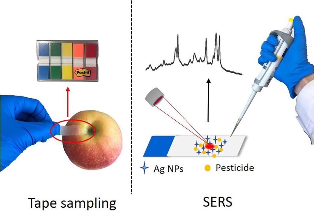 快速分析和识别农药残留是当前食品安全领域的一大研究热点,尽管各种大型仪器如色谱质谱联用技术等对定量痕量残留农药具有较高的灵敏度和准确性,但这些技术由于前处理方法复杂、仪器分析耗时长,且仪器体积大难以应用于现场(如农贸市场)检测。表面增强拉曼光谱(surface-enhanced