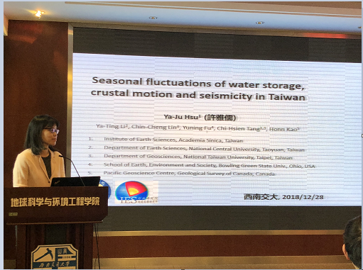 fluctuations of water storage, crustal motion and seismicity in Taiwan”的学术报告,其立足于国际学术前沿,详细介绍了季节性水荷重对地壳形变以及地震活动度的影响,报告的主要内容包括:(1)台湾地区区域构造背景;(2)季节性水荷载与地震事件的相关性分析;(3)水循环导致的GPS季节性垂向形变位移;(4)水文负荷导致的地壳应力和应变特征。