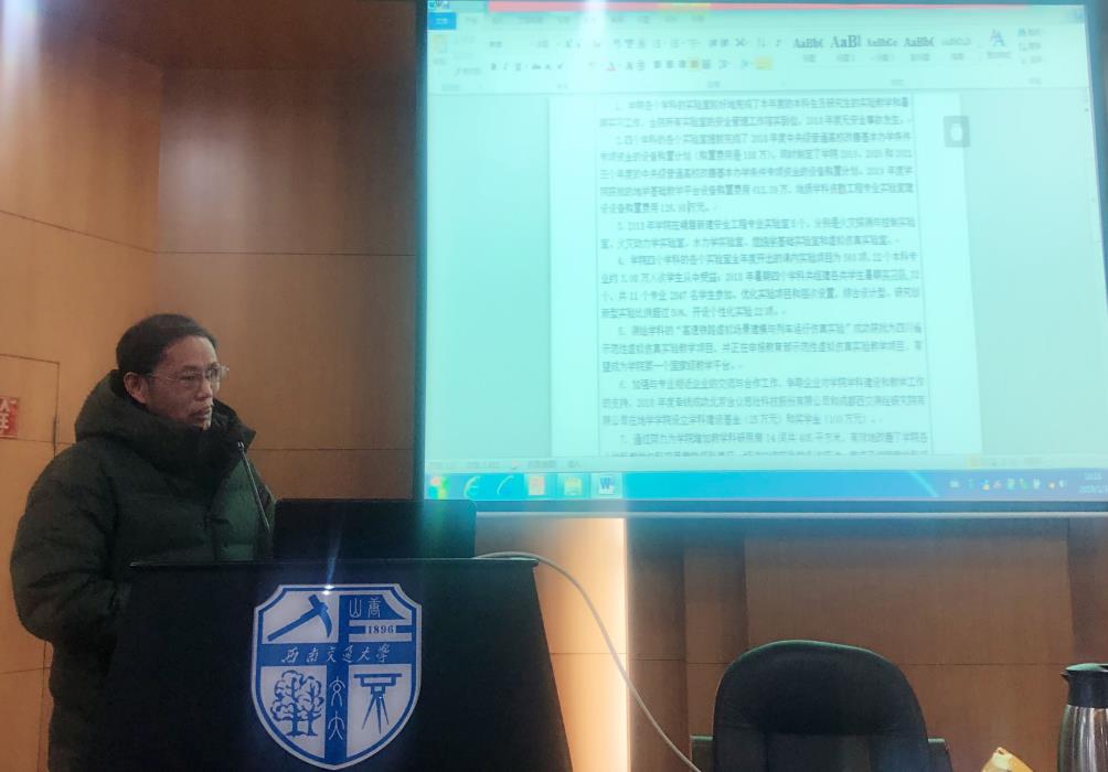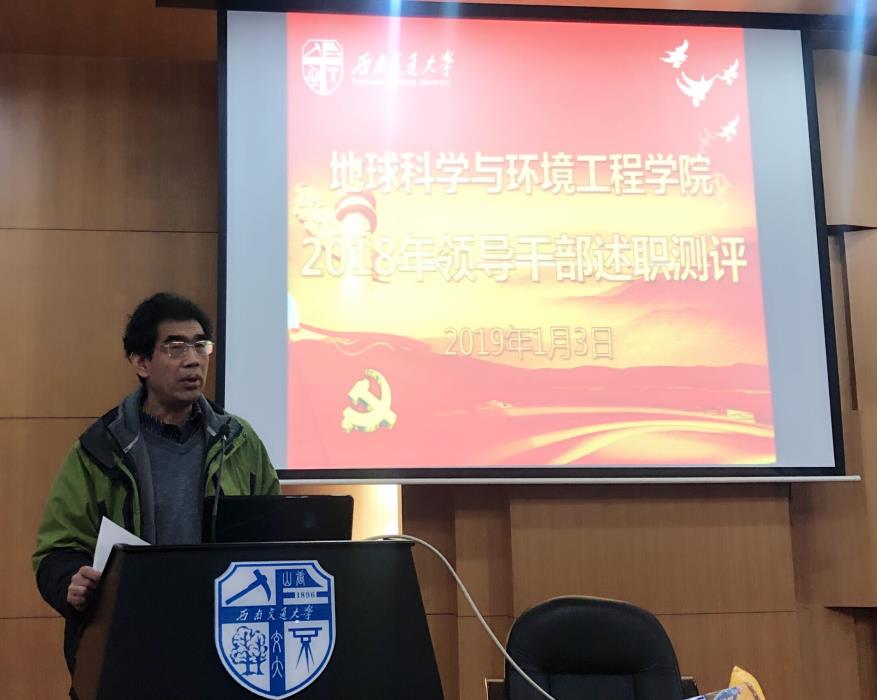 2019年1月3日,地球科学与环境工程学院于图书馆二号报告厅召开2019年第一次全院教职工暨中层领导干部述职大会,参加会议的有学院党政领导班子,全体教职工。大会由学院党委书记王齐荣主持。
