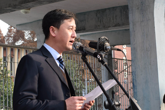 上午8:30,伴随着国歌声,开幕式正式开始。首先,受学校党委张学龙副书记委托,高增安为运动会致辞。