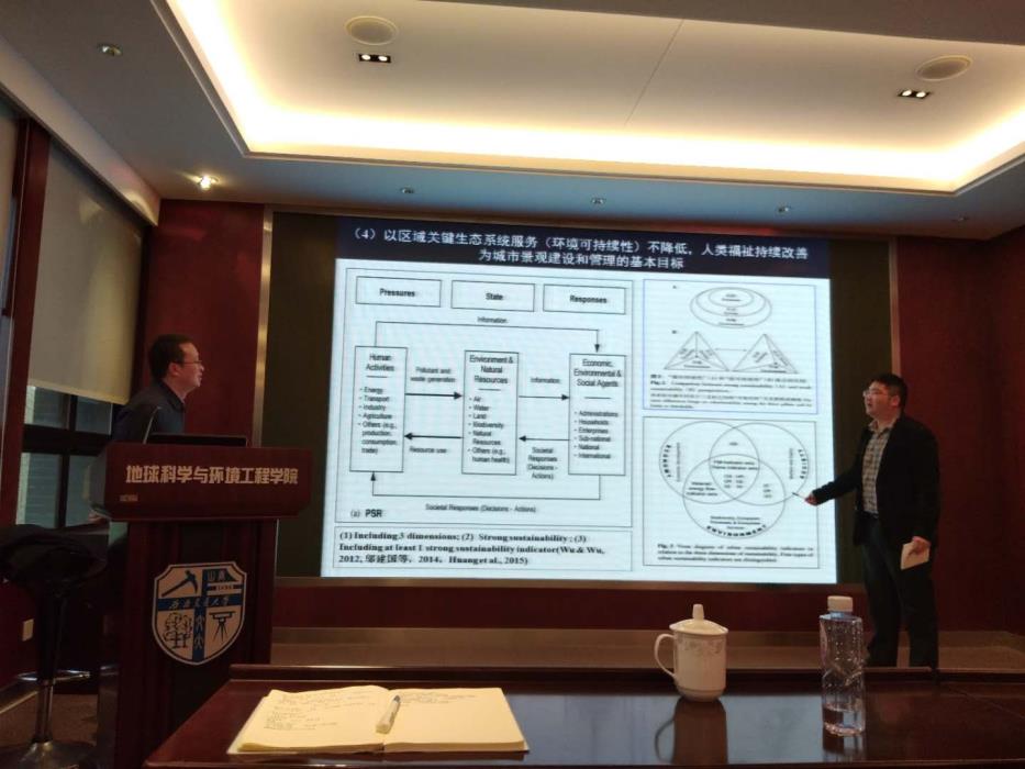 环境工程系主任赵锐教授主持学术报告会,介绍了何春阳教授的学术成就,相关学科骨干教师,硕士和博士研究生出席学术报告会。何春阳教授围绕‘’城市景观生态学过程与可持续性‘’主题,从什么是城市景观可持续性、基本原理和方法、事件案列、结论和讨论四个方面为师生带来精彩报告。