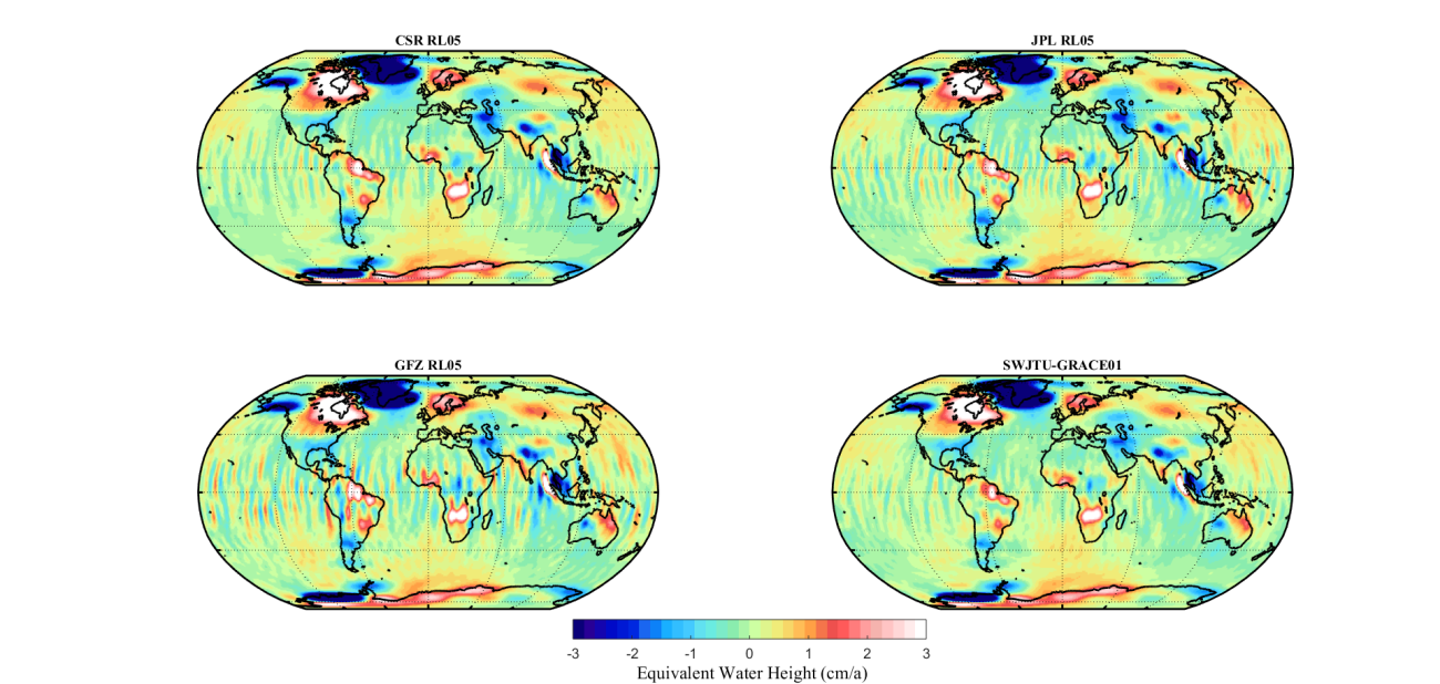 卫星重力测量团队在利用GRACE卫星数据计算高精度时变重力场模型方面取得重要进展。团队成员在传统的动力学方法上面不断改进,掌握了GRACE卫星重力测量数据处理的核心技术,利用学院计算中心所提供的计算设备,反演了第一代GRACE时变地球重力场模型(SWJTU-GRACE-RL01),与国际三大官方机构(CSR、JPL、GFZ)反演的时变地球重力场模型精度相当。该模型已被国际地球重力场模型中心(ICGEM)接收,并可在该网站免费下载(//icgem.gfz-potsdam.de/series/02_GRACE_monthly_other/SWJTU-GRACE-RL01)。据悉,该网站已发布了国内同济大学、华中科技大学、中科院测地所和武汉大学等相关科研团队的时变地球重力场模型产品。高精度时变地球重力场模型可用于监测全球质量变化,包括冰盖或冰川消融、陆地水储量变化、海平面变化、地震重力变化等研究。