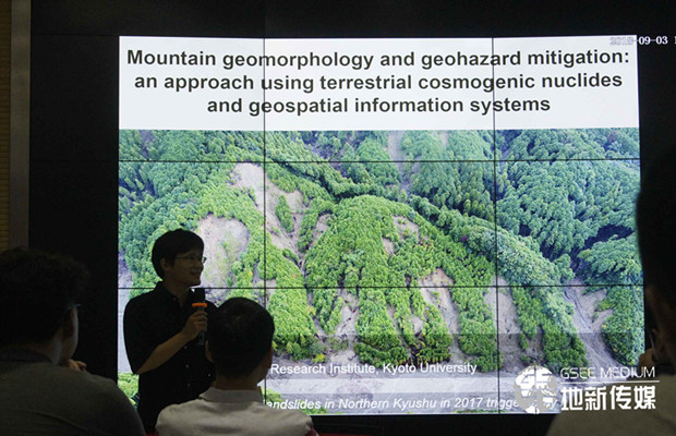 进行交流表示感谢,并就最新的研究进展向在场的老师同学,做了题为“山地地貌演化与地质灾害防治:一种利用陆地宇宙核素和地理空间信息系统的方法”专题报告。松四雄骑从“山地地貌和宇宙核素的新范式”讲起,通过对“加速器质谱法”等方法介绍向在场师生讲解了日本山地剥蚀量量化的方法。随后,松四雄骑介绍了分析预测降雨诱发型浅层滑坡的方法,并通过对鹿港具体示例的分析进行详细讲解。最后,针对报告内容,韩国漫画