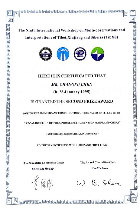 测绘遥感信息系袁林果教授的博士生由晓文、陈昌福和硕士生徐小凤参加本次会议,并分别作了“The sensitivities of ocean tide loading displacements to the upper mantle and crust in Taiwan”、“Recalibration of the gPhone instruments in mainland China”和“Qinghai lake level changes determined by Cryosat-2 altimetry data and its impacts on surface loading deformation”的学术报告,均赢得了会场的热烈讨论和提问。在本次会议中,博士研究生陈昌福获得最佳论文奖,专家学者高度称赞了博士生由晓文和硕士生徐小凤的相关研究工作,并鼓励他们再接再厉,取得更加突出的研究成果。