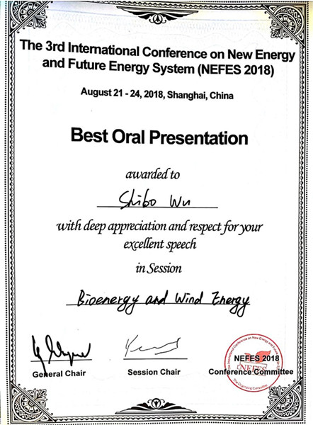 fuel: Leaching on wheat straw”报告和“Effect of Various Parameters on Anaerobic Digestion of Food Waste”墙报交流,受到与会学者一致好评。在本次会议中,吴士博同学获得最佳报告奖,由议主席德国波鸿大学Wagner教授为其颁奖,并受邀参加下一届会议。