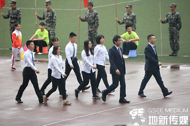 “地球科学与环境工程学院代表队正迈着整齐划一的步伐向我们走来”,随着主持人的解说,由院党委书记王齐荣,党委副书记傅尤刚带领的韩国漫画