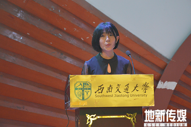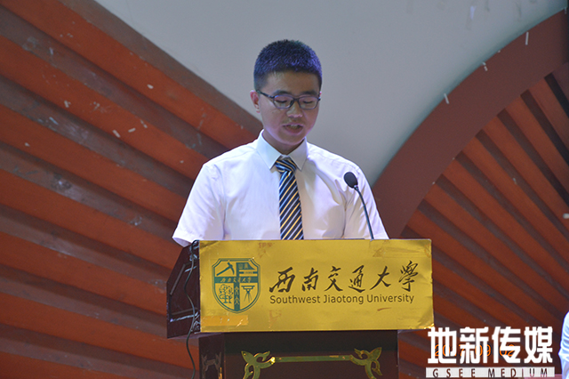 新生代表2017级环境工程系刘佳宁同学发言。刘佳宁同学讲到,大家从五湖四海而来,汇聚在百年名校西南交通大学,是每一位同学多少个日日夜夜埋案苦读努力的最好礼物,而这份礼物并不是一份无忧无虑的游乐场门票,而是一次自我成就的旅程。接下来四年,要做一个善良的人、做一个有丰富经历的人、做一个理性的人、做一个精神和品质高贵的人,重新规划,树立新的目标,并努力践行。