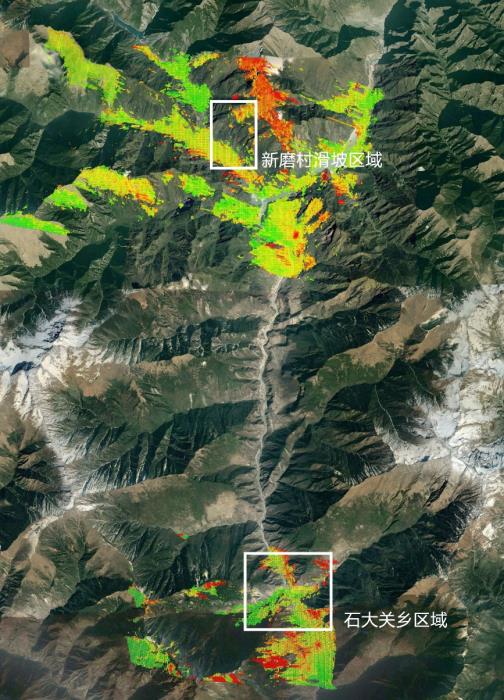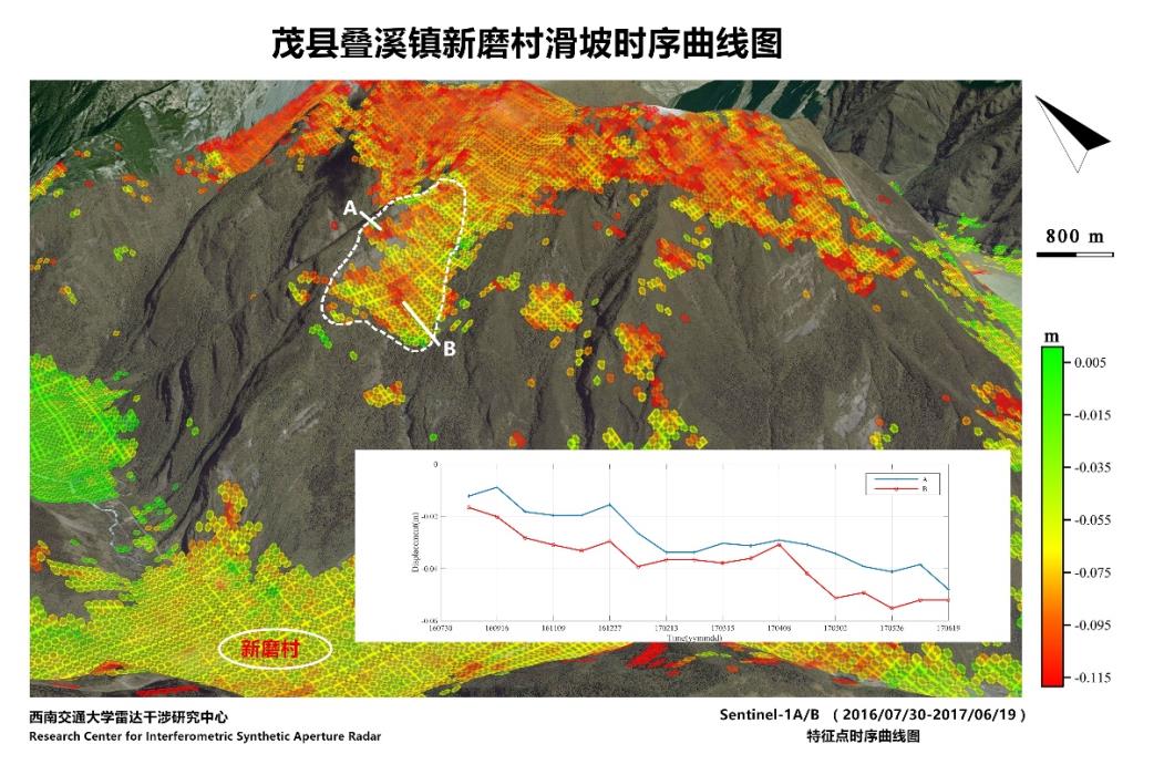 刘国祥教授领导的InSAR研究团队立即启动茂县相关滑坡位移时序计算与分析,持续下载2016年7月至2017年6月间多幅存档卫星SAR影像数据,基于合成孔径雷达干涉(InSAR)时序分析技术开展了大量的数据处理,得到了过去一年内茂县相关滑坡体表面每隔12天的位移累积量及其时间序列,相关结果已提交给参与现场救灾和灾情评估工作的有关专家。在分析叠溪镇新磨村滑坡区域及其周边范围内近一年的历史形变数据的同时,在石大关乡区域(距新磨村滑坡约18.5公里的)也探测出了较大位移量的不稳定滑坡体。下图陈述了新磨村和石大关滑坡的位置及其在2016年7月至2017年6月间的坡体表面位移累积形变及时序形变结果。
