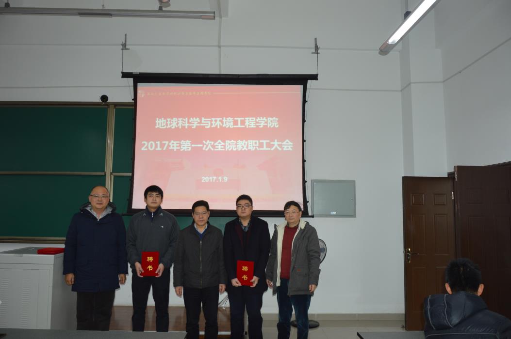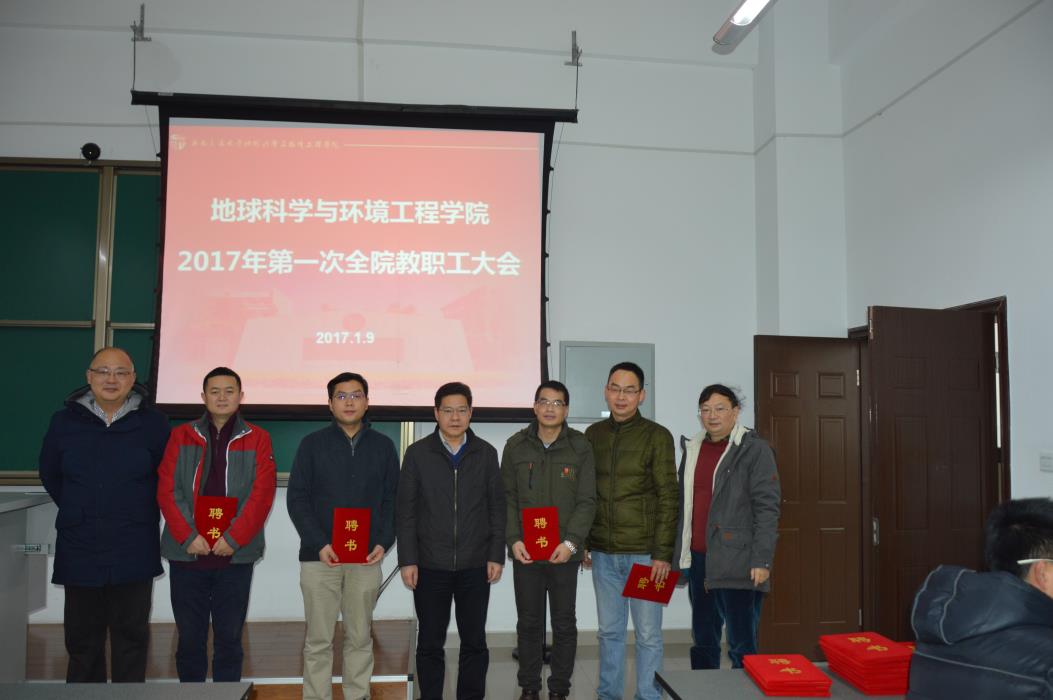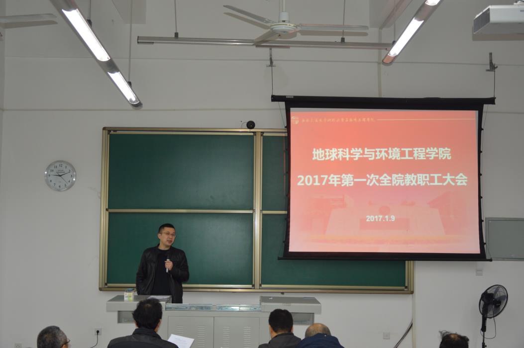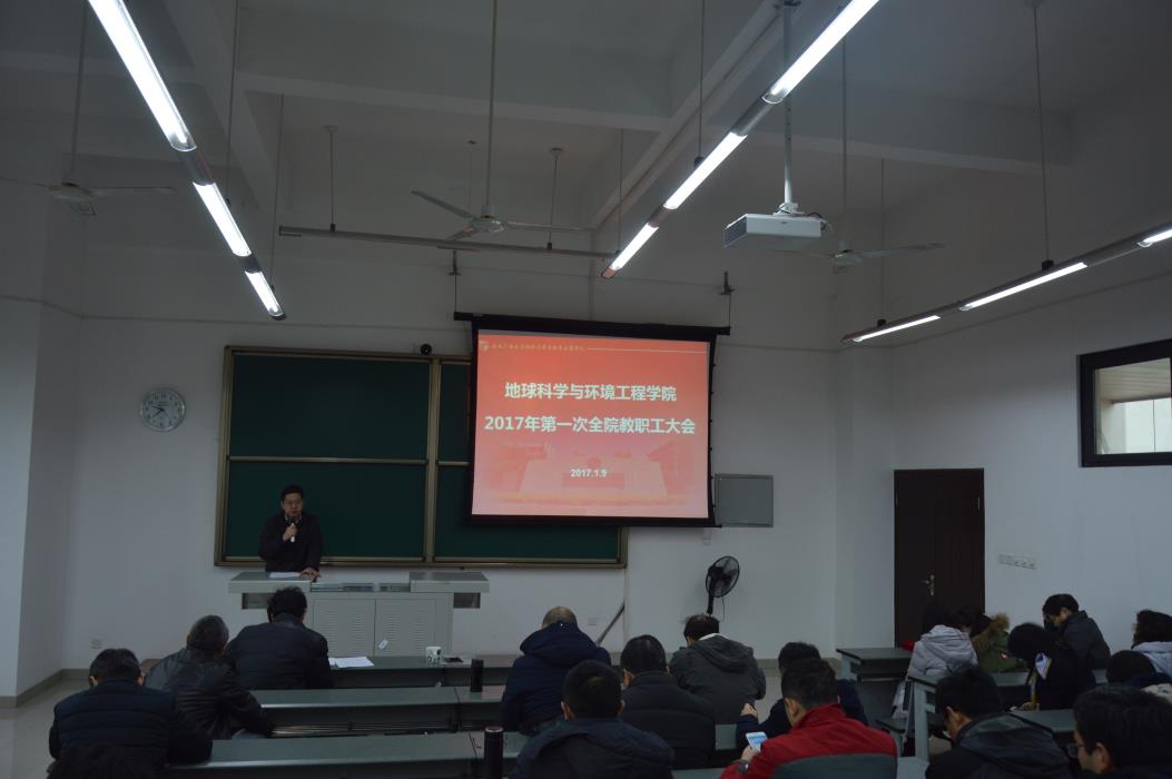 1月9日,地球科学与环境工程学院在X9541召开2017年第一次全体教职工大会。大会共分为两个阶段,第一阶段,举行各系新班子聘任仪式;第二阶段,院党委书记王齐荣传达全国高校思政工作会议精神,以及假期安稳工作、院长刘国祥介绍2017年工作部署。本次大会由院党委副书记傅尤刚主持,参加大会的有学院全体教职工。