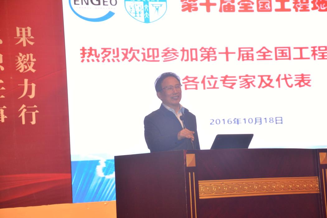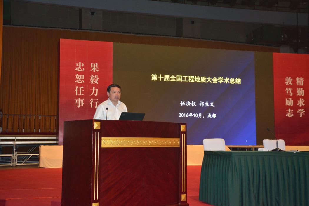 接下来工程地质专委会秘书长伍法权教授对整个大会学术报告进行了总结,首先他对本次大会圆满举办表示祝贺,并对大会承办单位——西南交通大学认真细致、卓有成效的筹备和会务组织工作给予了充分肯定和感谢。他在总结中提到,本次大会共有1300余位代表参会,征文收集454篇论文,经专家评审,共录用257篇(其中9篇收录在《西南交通大学学报》,34篇收录在《工程地质学报》正刊,其余论文收录在《工程地质学报》增刊上);