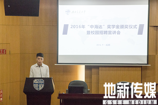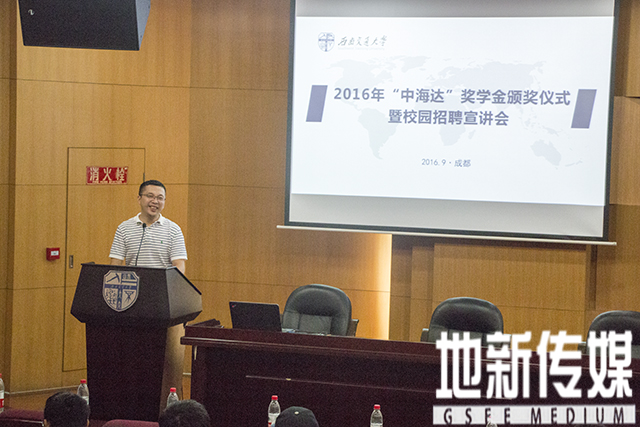 9月19日晚7时,2016年“中海达”奖学金颁奖仪式暨校园招聘宣讲会在图书馆2号报告厅准时拉开帷幕,会议由地球科学与环境工程学院党委副书记傅尤刚主持。中海达集团副总裁鲍志雄、定位公司总经理罗树江、成都分公司总经理谢志海、测绘公司研发部经理李前斌、集团人力资源经理向占伟等领导出席会议。
