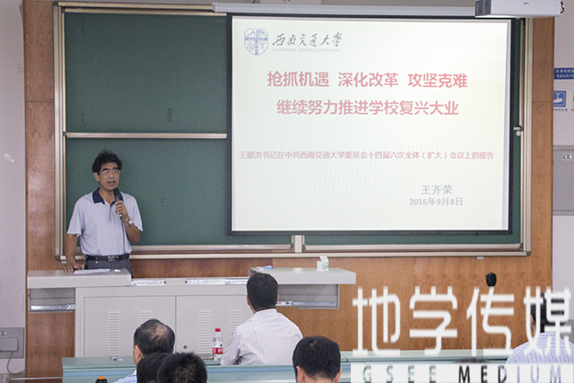接着,王齐荣书记传达了校党委书记王顺洪在中共西南交通大学委员会十四届六次全体(扩大)会议上的讲话精神,即“抢抓机遇、深化改革、攻坚克难,继续努力推进学校复兴大业”并从“学校第十四次党代会以来主要工作推进情况、学校发展面临的新形势、学校下一阶段重要工作任务安排以及全面从严治党,为学校改革发展做好引领与保障”四个方面系统地总结了会议要点。除此之外他还介绍了王顺洪书记赴深圳调研学校研究院的相关情况以及徐飞校长对当下学校面临的发展形势的分析,并对2016年下半年工作要点的部署安排。