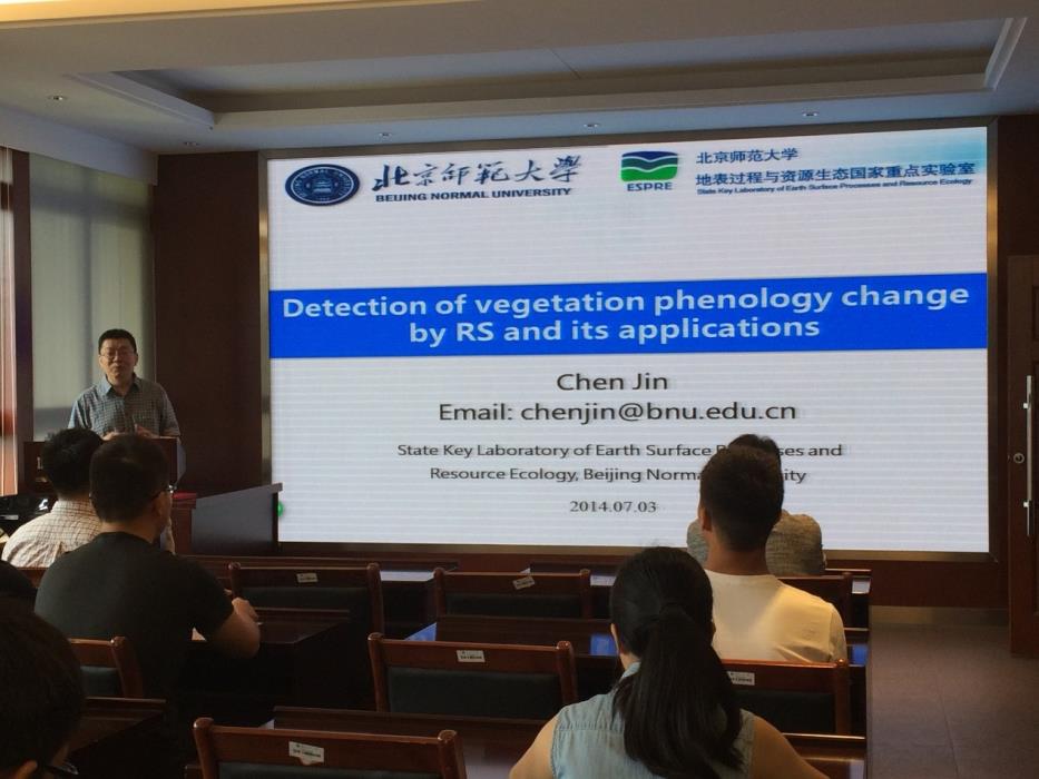 受聘仪式结束后,陈晋教授作了题为“遥感物候探测及应用”的精彩学术报告。陈教授以“什么是物候”、“为什么有物候”的设问方式开题,指出了遥感技术在物候变化检测中的重要意义,并分析了遥感分析框架下现有方法的局限性和不足,继而提出了基于NDVI降尺度和基于CCSM的两种物候变化检测方法。最后,陈教授以沙尘暴为例,分析了物候在生态上的应用。