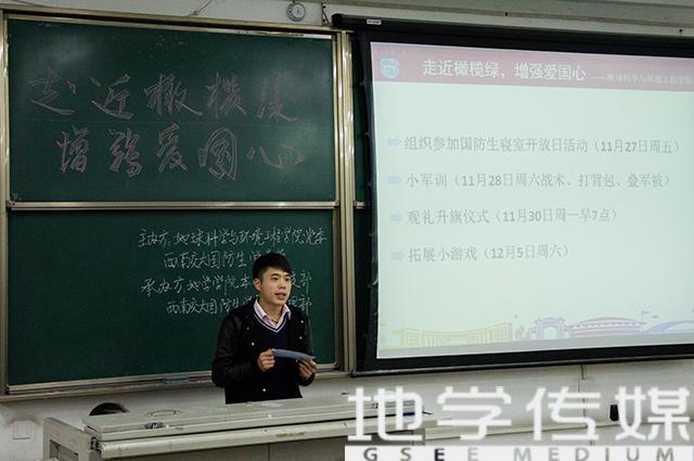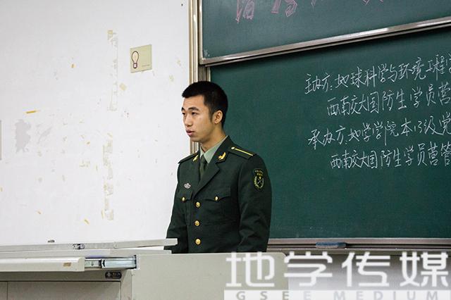 接下来进入活动第三项:由12级国防生刘鑫解释本次“橄榄绿”活动的原因与意义。他先向我们介绍了各级优秀国防生典范,紧接着又向我们展示了国防生们的训练情况,随后又提到他们的业余生活与荣誉。最后他以“以我青春,捍我国防。竢实扬华,自强不息。”作总结。