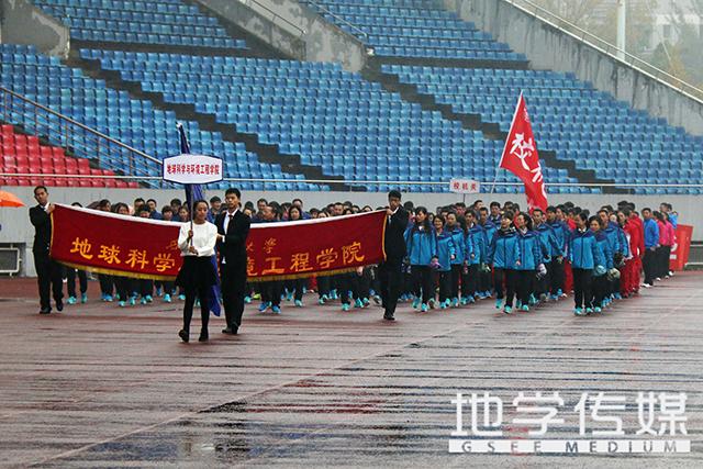的运动员代表身着蓝色的运动服,用铿锵有力的步伐,洋溢着地学应有的青春与活力。