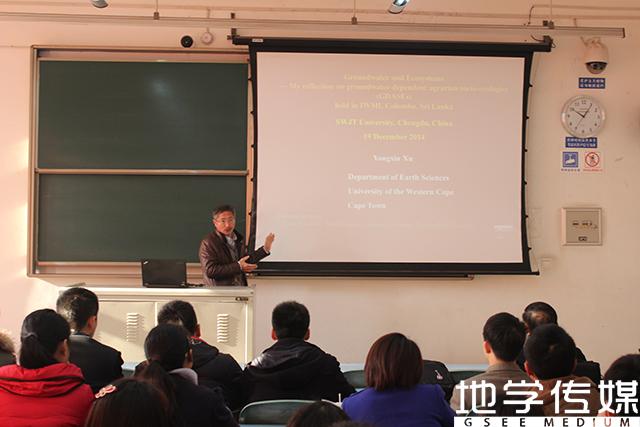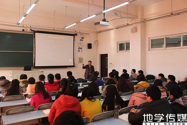 讲座围绕地下水与生态保护展开,徐永新教授首先指出,地下水与生态环境保护是相互制约、相互影响的,研究地下水应结合地质、生态、大气等多个领域,在可持续应用地下水的情况下寻求最高经济效益,服务人民。他提出,在水文地质研究中,通常会面临气候变化及全球变化,要注意不断发展改变的环境对研究的影响,并善于发现、思考和解决问题;在地下水应用前,应明确研究思路,了解当地水文地质属性,分析生态与水文地质之间的相互联系,以因地制宜,找到生态保护与经济发展的平衡点。随后徐教授以幽默风趣的语言,深入浅出地讲解了多个典型例子,如:南非地下水的管理与应用现状;我国丽江古城优良的地下水应用给排系统;夏威夷地下水应用的管理与规范;印度地下水利用的经济效应;黑龙潭生态修复--利用地下水系统补给地表水的研究等,极大地开阔了现场同学的思维和眼界,让同学们认识到地下水与生态保护的重要关系。最后他对比分析了世界各个国家的地下水管理、利用、污染、修复的现状,指出在水文地质的研究中可能面临的问题,鼓励大家建立跨领域分析解决问题的思路,让同学们对本专业应用与研究的方向有了新的认识。