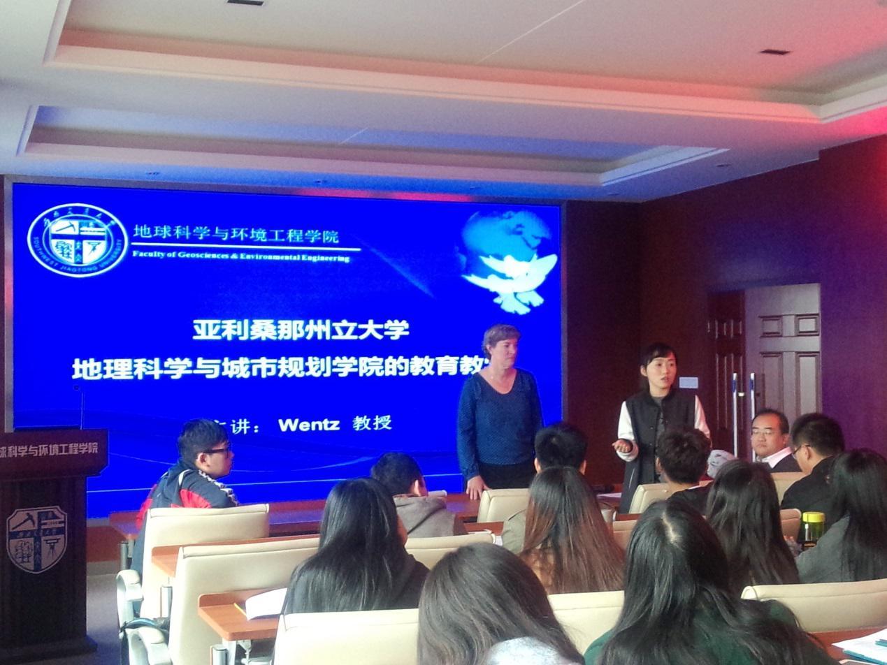 ,在学院第一会议室与众多本科生和研究生一起,进行了以 “亚利桑那州立大学地理科学与城市规划学院的教育教学”为主题的交流会。