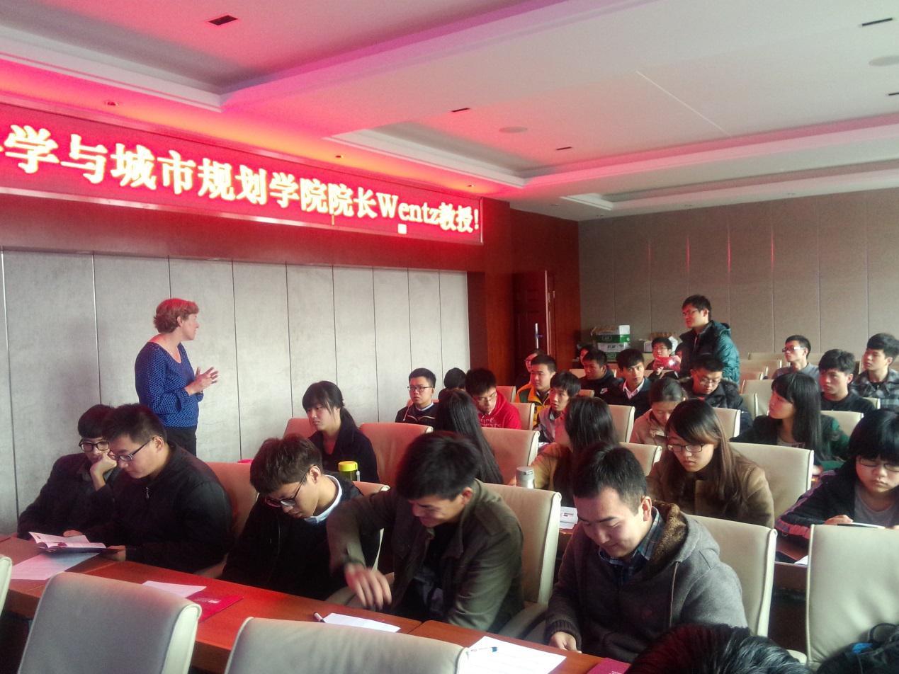 Wentz教授此行的主要目的是向大家介绍亚利桑那州立大学的地理学研究情况,以及学校开展的GIS方向硕士教育项目。在简单介绍亚利桑那州立大学的基本情况之后,Wentz教授以“Spatial Thinking”为分析问题的出发点,结合小孩肥胖症、城市热岛效应等目前广受关注的社会现象,阐述了如何运用GIS空间分析技术来解决此类问题,让在座同学在实例中领略GIS空间分析技术的高效性和实用性。期间,Wentz教授还通过问卷等方式积极鼓励在场学生就她提出的问题表达自己的观点。同学们各抒己见,现场气氛十分活跃。