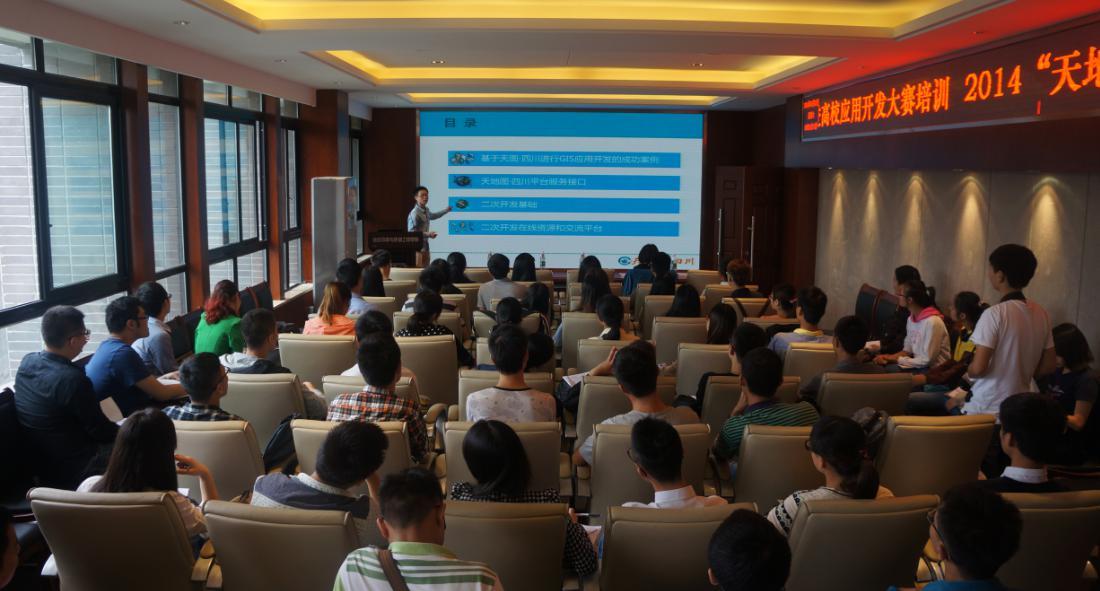 2014年9月27日,“天地图·四川”进高校应用开发大赛培训活动在西南交通大学犀浦校区成功举行。“天地图·四川”进高校应用开发大赛由四川省测绘局基础地理信息中心主办,四川省测绘学会教育与科学普及工作委员会及四川省测绘学会地图制图与GIS专业委员会联合承办。