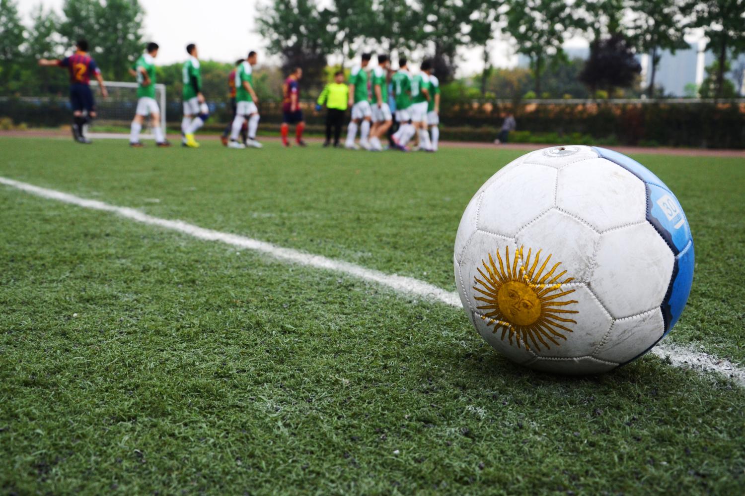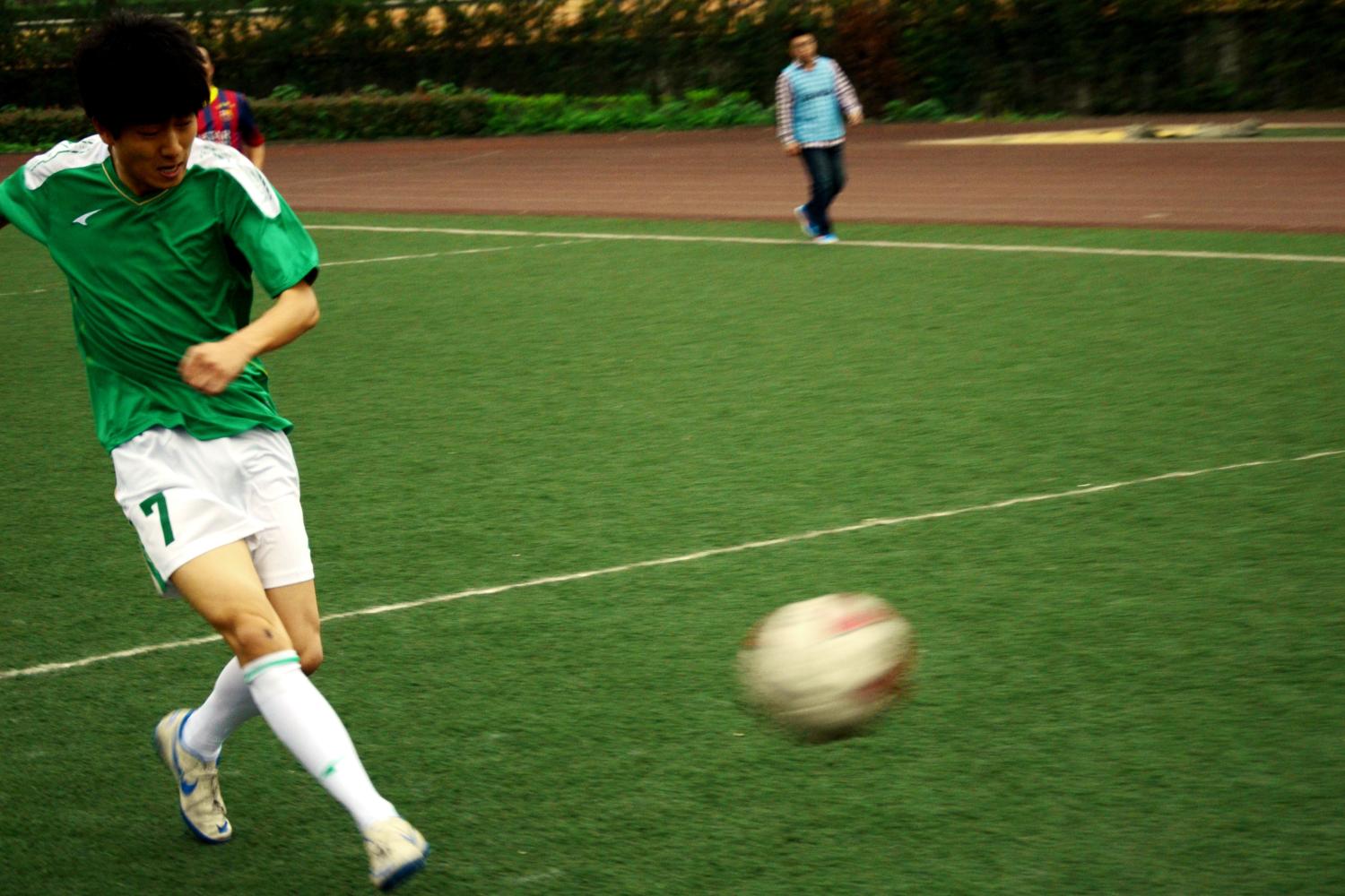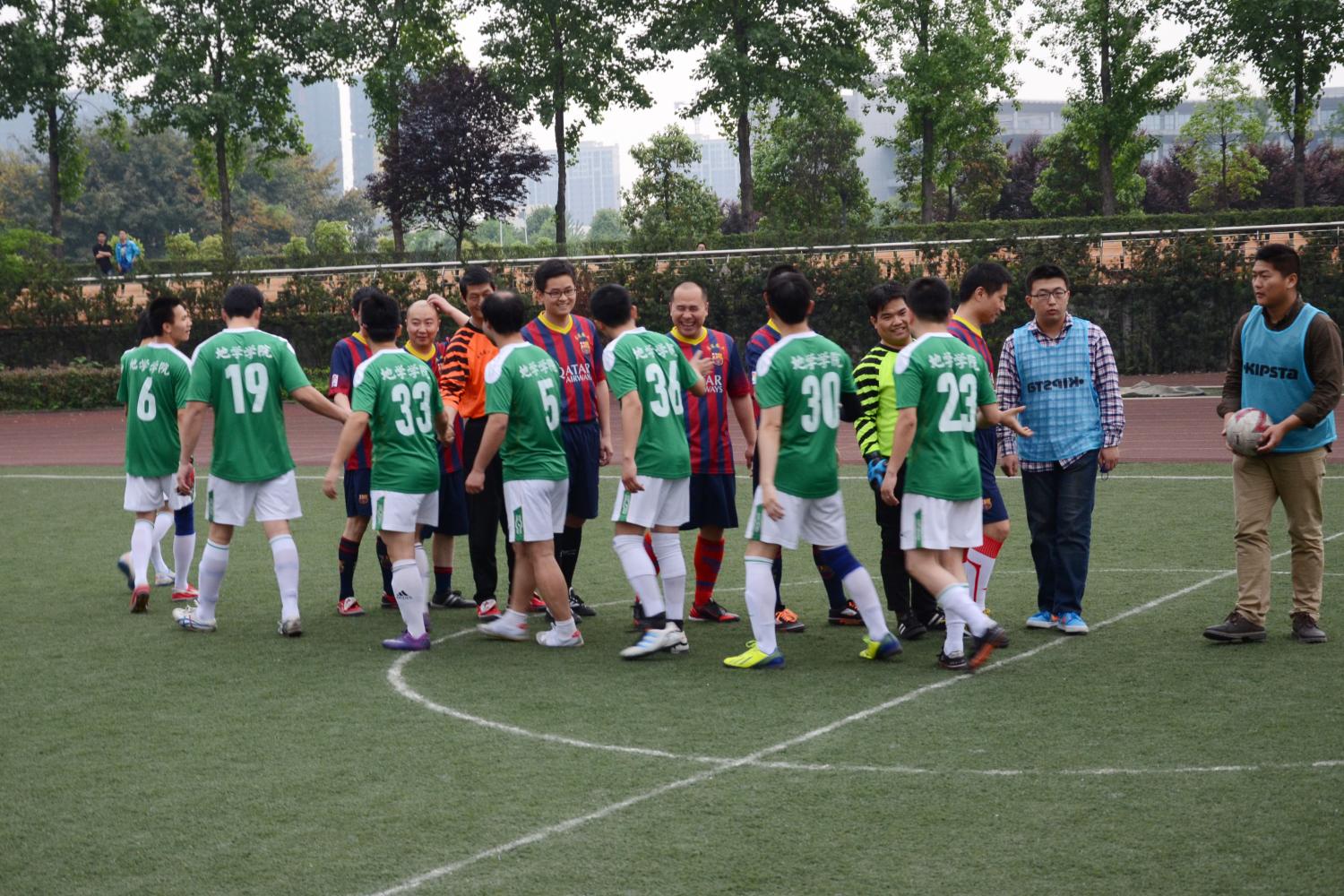 教职工足球队倍感压力。经过赛前热身,比赛终于在下午五点四十正式开始。