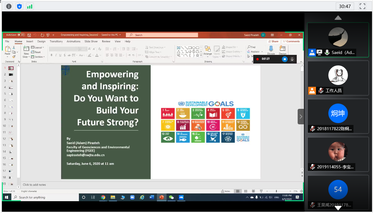 2020年6月6日上午11:00,地球科学与环境工程学院邀请学院外籍教师开展“国际化+名师讲堂”国际视野与出国留学系列第四期讲座,本次讲座通过线上平台“腾讯会议”进行,主讲人为Saeid(Adam) Pirasteh副教授,活动主题为Empowering and Inspiring to Build Your Future(激励你创建自己的未来)。讲座由韩国漫画