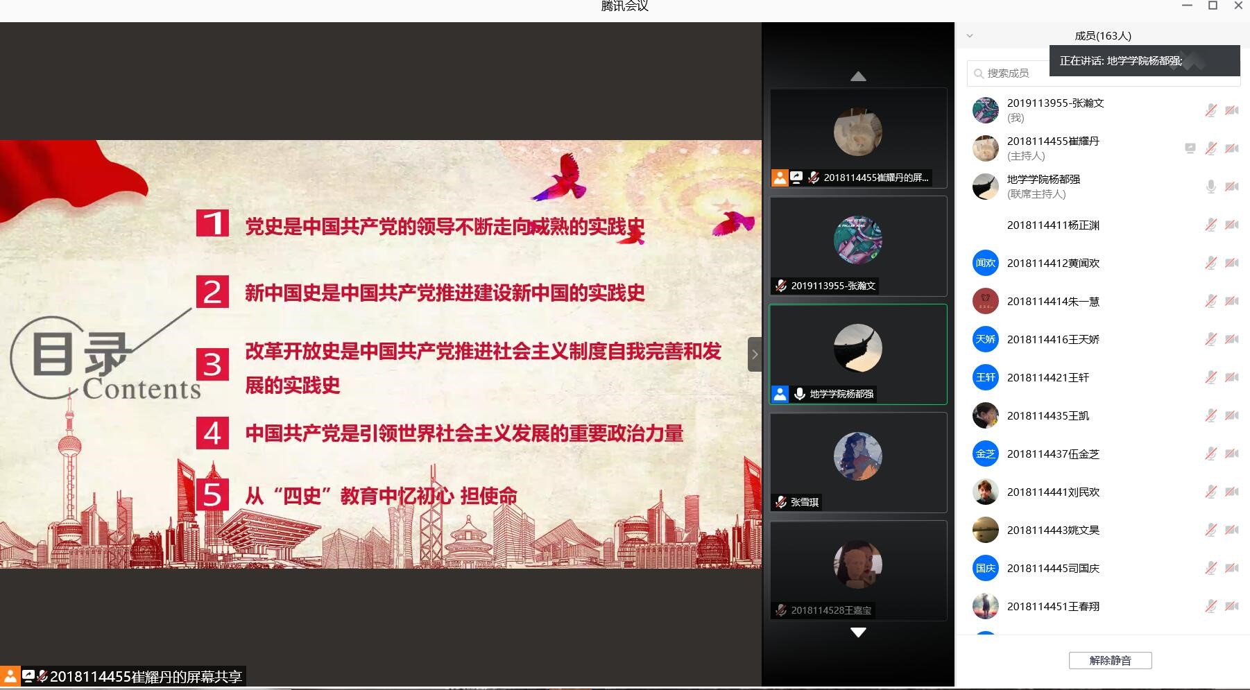 为深入学习并贯彻落实习近平总书记关于党史、新中国史、改革开放史、社会主义发展史(以下简称“四史”)的重要讲话和指示精神,持续深化新时代爱国主义教育。18级环境工程、消防工程、安全工程学生于10月14日参加了“四史”学习,本次学习由18级辅导员杨都强老师以腾讯会议为平台开展并主讲。