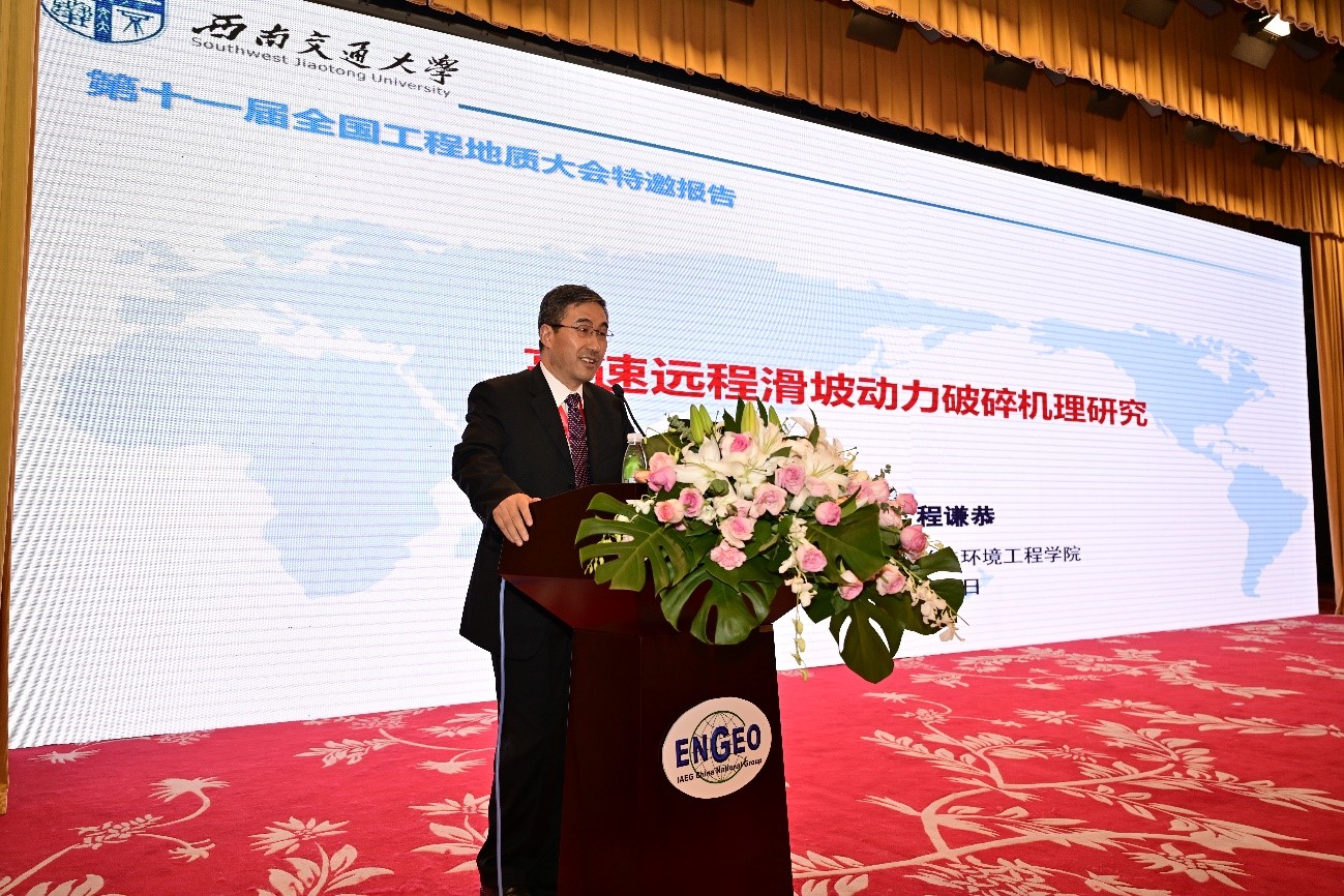 程谦恭教授做了题为“高速远程滑坡动力破碎机理研究”的大会特邀报告,详细汇报了其团队近年来对青藏高原典型高速远程滑坡的调查分析工作,以及高速远程滑坡动力破碎物理模型实验研究成果。该项工作系统分析了高速远程滑坡源区岩体结构、滑体碎屑化过程与滑坡运动距离三者之间的关系,揭示了高速远程滑坡动力破碎机理,受到了参会学者的高度赞赏。本项研究成果被国家第二次青藏高原地质环境与地质灾害综合科考(任务九)办公室列为2020年度七大进展成果之一,并在大会上进行了报导。大会闭幕式上,第十一届全国工程地质专业委员会秘书长祁生文研究员代表工程地质专委会将高速远程滑坡动力破碎机理列为我国工程地质学科前沿焦点上的重大进展。