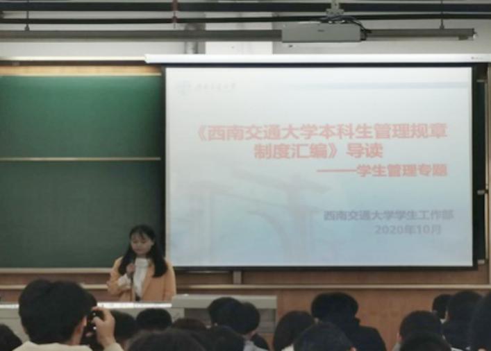 纪律处分相关制度,以及传达了切实解决同学问题的决心,她在现场随机调查了同学们进入大学后的变化,并提出相应的解决方法,并从生活、学习、安全、人际沟通、时间管理等方面对同学们的学习生活进行指导。