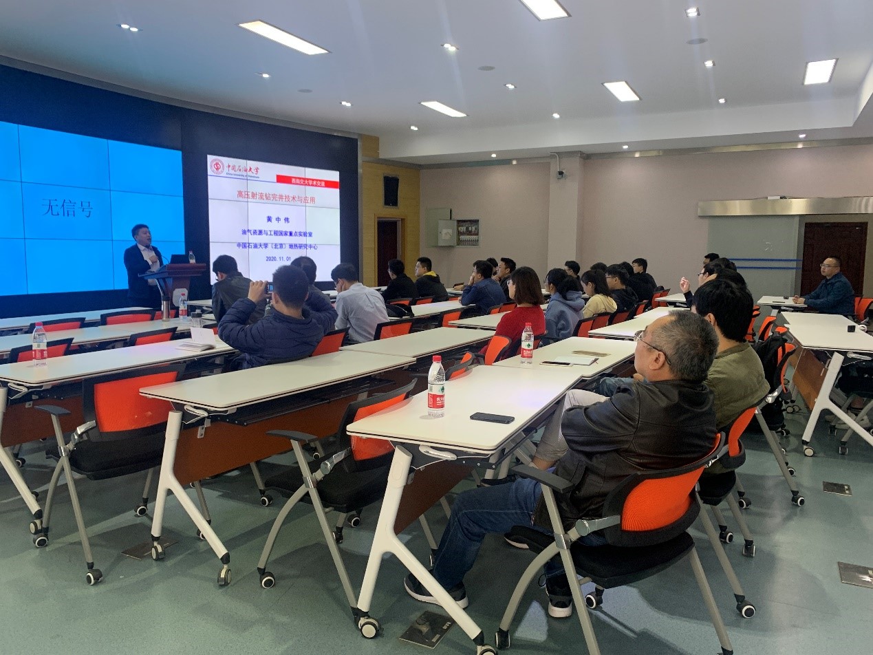 黄中伟教授针对非常规资源、地热能钻采中的基础理论与技术难题,围绕新型射流高效钻井理论与技术、新型射流完井方法与技术、地热能高效钻采技术开展了学术报告。讲座结束后,同学们与黄中伟教授开展了深入交流与讨论,黄老师鼓励同学们要开拓创新,认为工科学生应该广泛积累新材料、新理论、新技术知识,积极开展学科交叉,才更容易取得出色的学术成果。