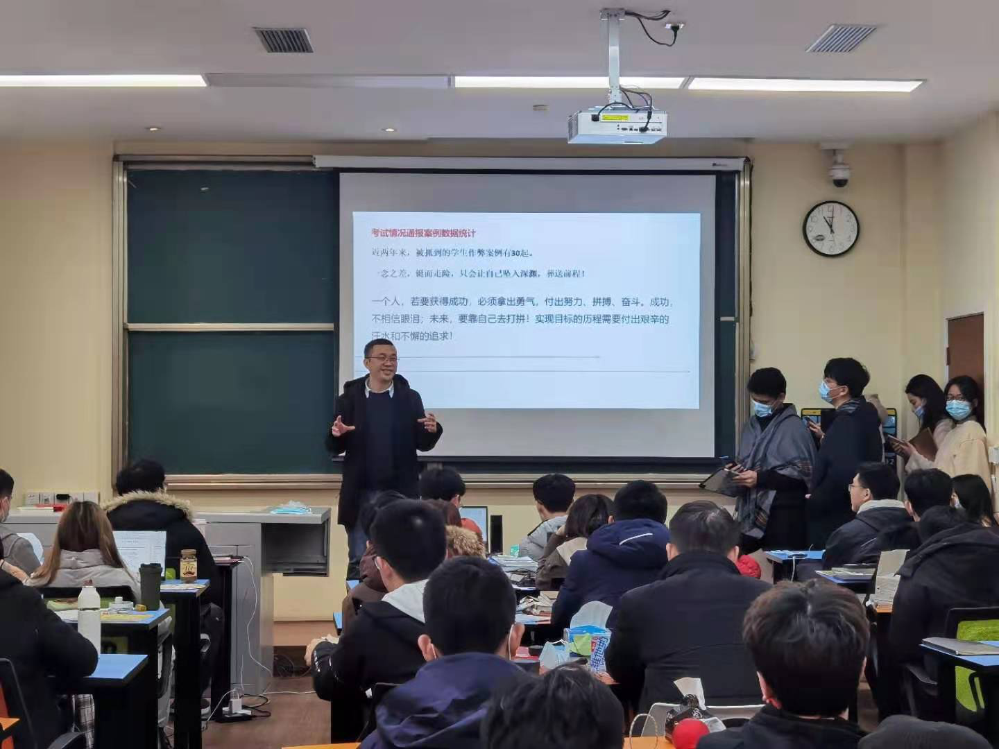 接着,傅尤刚通过列举考试情况通报案例和相关数据统计,叮嘱同学们诚信考试,不要因为一念之差做出错误的行为。表示实现目标的历程需要付出艰辛的汗水和不懈的追求,选择正确的道路,脚踏实地一直走下去,作为大学生在期末考试中要做到积极备考,自信临考,诚信应考!