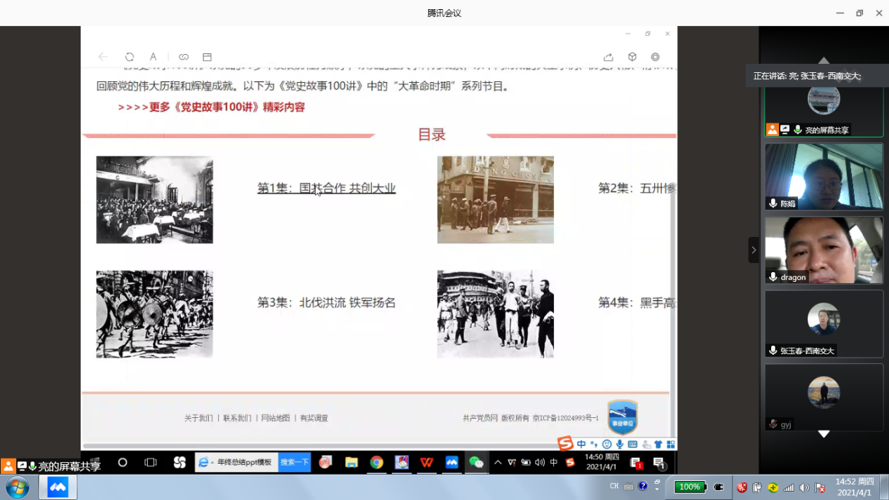 活动首先组织全体党员学习了清明节主题PPT——了解清明节概述知识,重温赵尚志、雷锋、邱少云等革命先烈的感人故事,倾听李文亮、彭银华、“凡人小林”、王春天等抗疫英雄的模范事迹,最后发出安全文明过节的倡议。随后,还组织全体党员观看了“党史故事100讲”、“[面对面]杨德盛:冰血长津湖” 、“ [探索发现]英雄志·刘胡兰” 、“《百战经典》热血忠魂·方志敏”等相关视频,引导各位党员在慎终追远、致敬英雄的情怀中弘扬传统、增进爱党、爱国的情感。