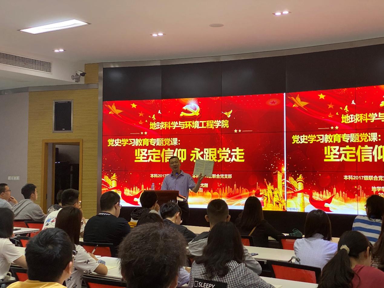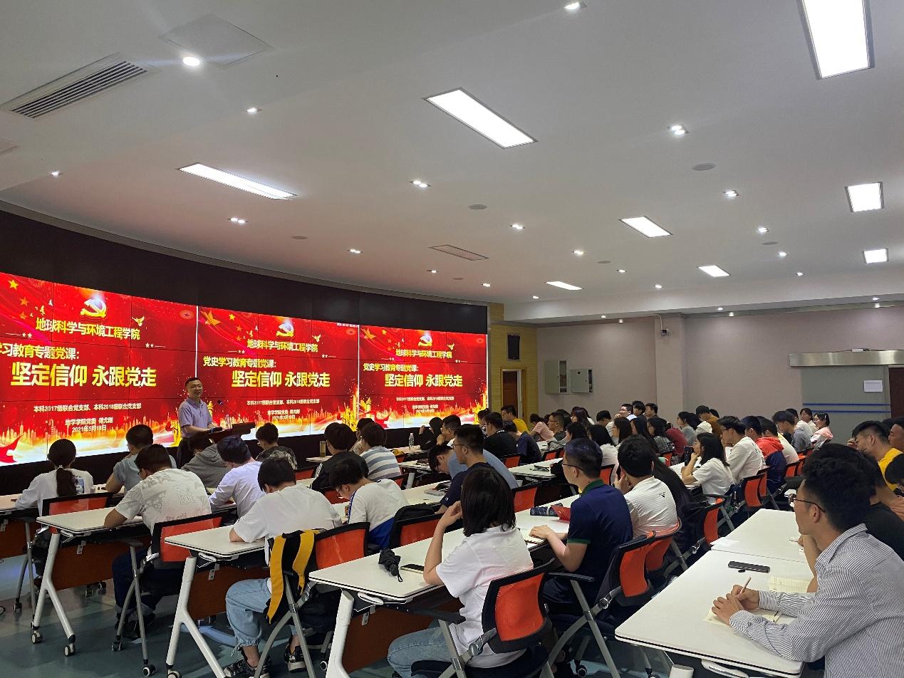 5月18地球科学与环境工程学院党委副书记傅尤刚于X4243多功能报告厅,面向本科2017级联合党支部和本科2018级联合党支部开展党史学习教育专题党课,党课以“坚定信仰永跟党走为主题。2017级辅导员老师翟琦主持学院本科2017级联合党支部、本科2018级联合党支部全体党员参加学习会。