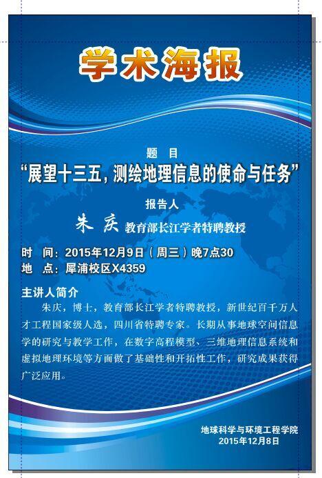 讲座地点:犀浦校区X4359 讲座题目:“展望十三五,测绘地理信息的使命与任务”