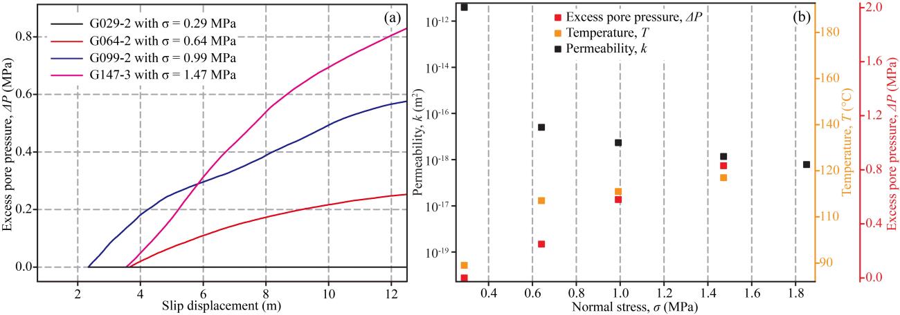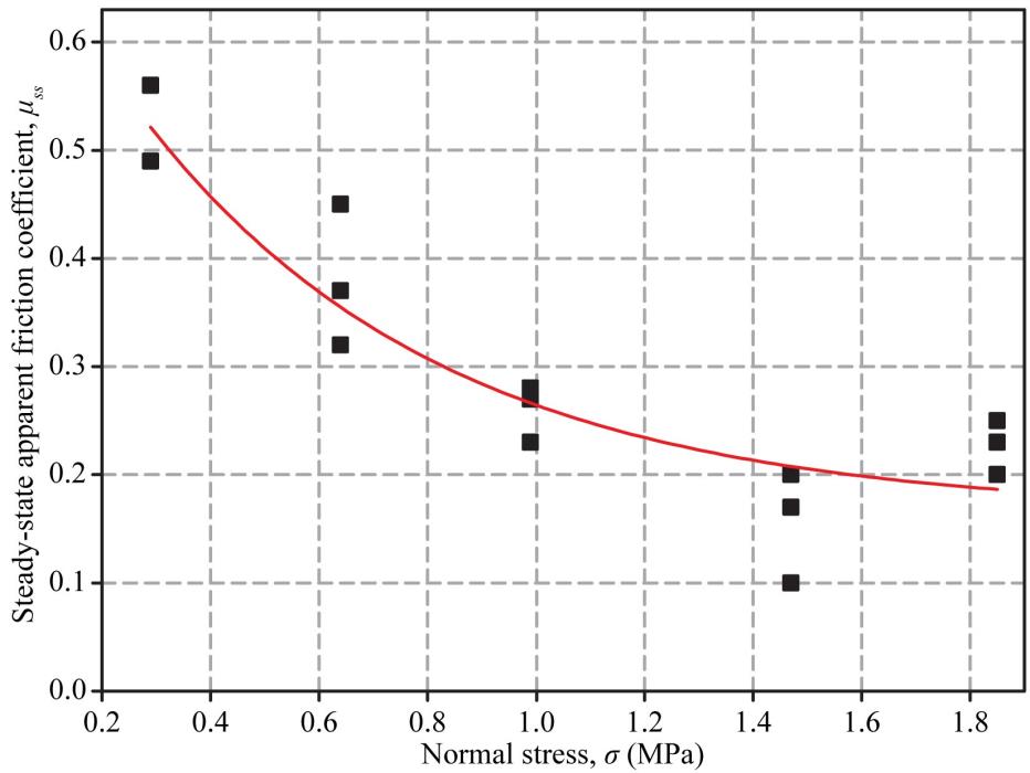 (1) as normal stress increases, the steady state apparent friction coefficient (μss) of the soil decreases, indicating a normal stress-dependent feature of μss; (2) the higher the normal stress, the lower the decay rate of μss; (3) water vaporization induced by frictional heating is commonly observed in the tests accompanied by large decreases in μss, and excess pore pressure is generated in the shearing zones of the samples due to vapor accumulation; and (4) with increases in normal stress and decreases in soil permeability, an increasing feature of excess pore pressure is reached. Based on the experimental results, it was proposed that the coupled effects of water vaporization induced by frictional heating in avalanche basal facies and depth-dependent permeability of avalanche basal facies should be contributed to the volume effect of rock avalanches.