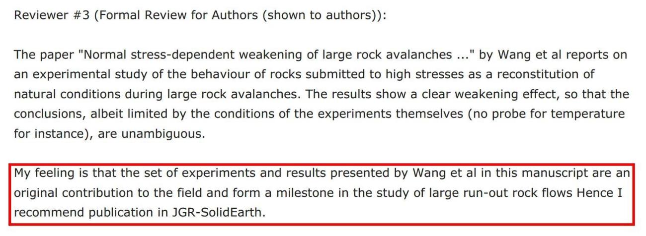 This research results have recently been published on the internationally renowned Nature Index journal JGR-Solid Earth. Because that the results have achieved a semi-quantitative study on the long-standing unresolved scientific problem of the volume effect of rock avalanche, revealing the intrinsic dynamic mechanism of the volume effect of landslide, which is highly evaluated by reviewers: “My feeling is that the set of experiments and results presented by Wang et al in this manuscript are an original contribution to the field and form a milestone in the study of large run-out rock flows Hence I recommend publication in JGR-Solid Earth.”