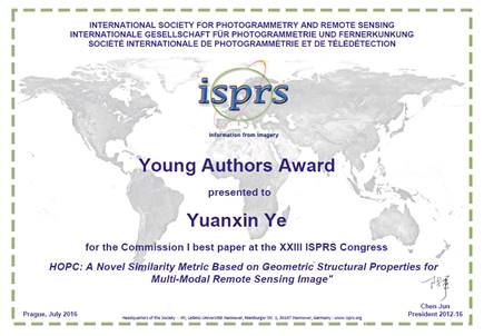 Fig.1 Best youth paper award of ISPRS Congress 2016