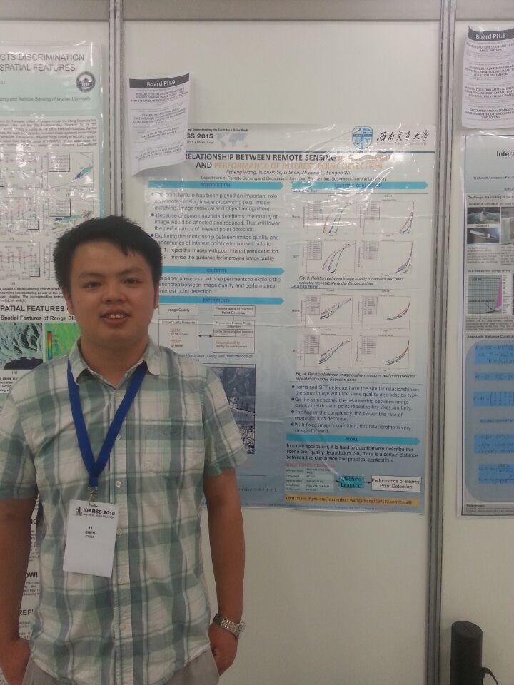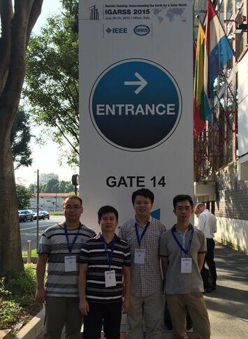 The International Geoscience and Remote Sensing Symposium 2015 (IGARSS 2015) was held from July 26th through July 31th, 2015, at the Convention Center in Milan, Italy. This is one of the most influential conferences in geoscience and remote sensing community, and attracted over 2000 academics and industry professionals from over 60 countries. Dr. Min Chen, Dr.Yuanxin Ye, Dr. Li Shen, and Jicheng Wang (graduate student) in our faculty attended the conference. Dr. Chen and Dr. Ye gave oral presentations titled “GGSOR: A GAUSSIAN-GAMMA-SHAPED BI-WINDOWS BASED DESCRIPTOR FOR OPTICAL AND SAR IMAGES MATCHING” and “AUTOMATC MATCHING OF OPTICAL AND SAR IMAGERY THROUGH SHAPE PROPERTY”, respectively. Dr. Shen and his graduate student Jicheng Wang gave a poster presentation titled “RESEARCH ON RELATIONSHIP BETWEEN REMOTE SENSING IMAGE QUALITY AND PERFORMANCE OF INTEREST POINT DETECTION”. IGARSS provides our faculty members and student an ideal forum for obtaining up-to-date information about the latest developments, exchanging ideas, identifying future trends and making networking with the international geoscience and remote sensing community.