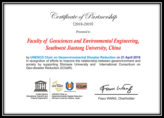 In April 2018, the School of Earth Sciences and Environmental Engineering (Southwest Jiaotong University) became the international collaboration unit of UNESCO's UNESCO-Chair on Geoenvironmental Disaster Reduction and received a certificate.
