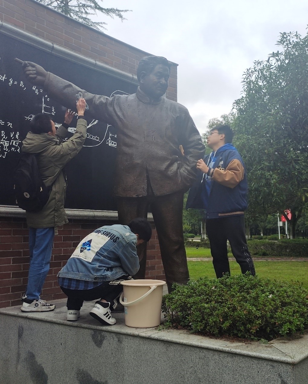 伟人应该被我们所铭记与敬仰,其雕塑更应被我们所保护。校园雕塑,积淀着我们的历史、传统、文化和社会价值,蕴含有巨大的潜在教育意义。因此,作为校园形象的一个重要组成部分,保持校园雕塑的整洁显得尤为重要。包括第十二小组在内的多个小组组织进行了校园雕塑擦洗活动,在他们的努力下,校园雕塑以崭新的面貌继续见证交大学子的成长。