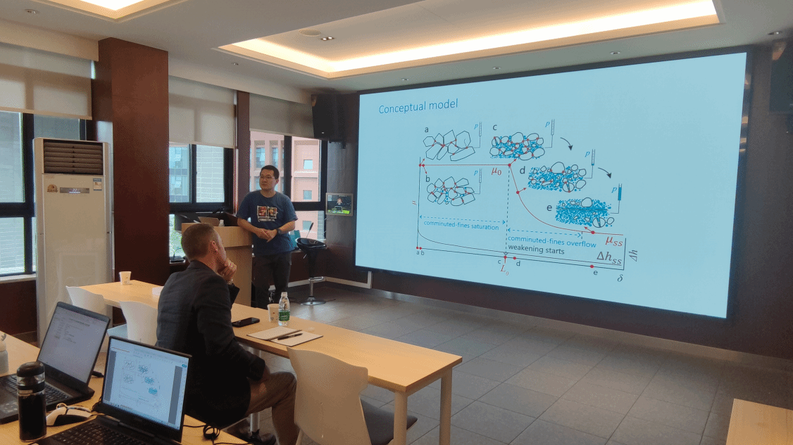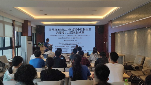 做题为《Granular Friction in Multi-scale Earth Dynamics: from Landslide to Earthquake》的学术报告。常承睿特聘研究员毕业于京都大学地球与行星科学系,主要从事与地震、滑坡和火山等大规模地球物理过程相关的实验与统计物理研究,近期主要集中于颗粒材料的摩擦行为、蠕变与破坏时间预报相关问题。该报告属于程谦恭教授团队举办的“创源大讲堂”系列讲座之一,由王玉峰特聘研究员主持,共计五十余人积极参与其中。